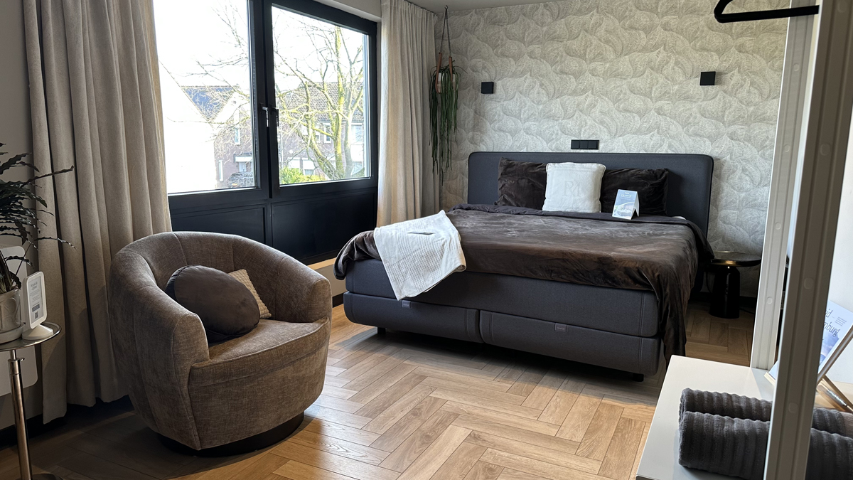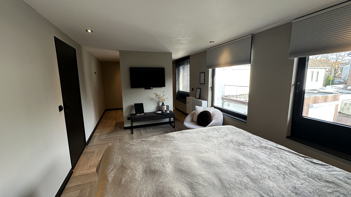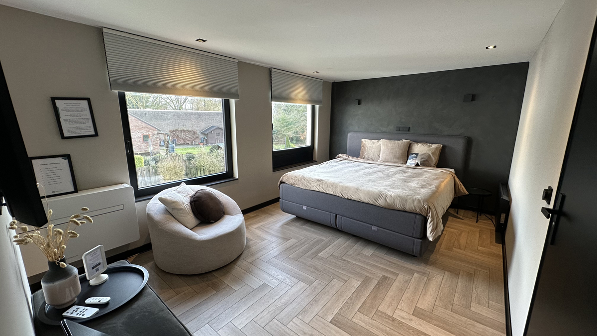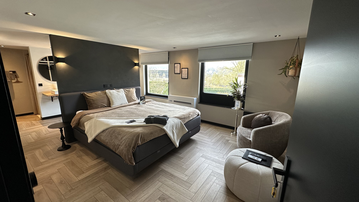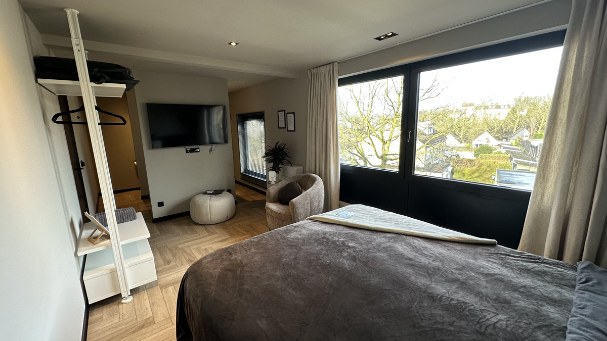 Deze kamer aan de voorzijde van het Boutique Hotel kijkt uit op de rustige buurt Hekerbeek en de lokale weg met bomenlaan.